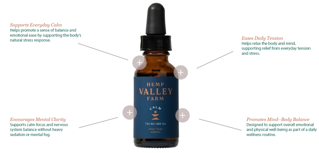 Hemp Valley Farm Calm CBD Oil (750mg) is a premium, full-spectrum tincture crafted from organically grown, non-GMO hemp to support calm, balance, and everyday stress management.