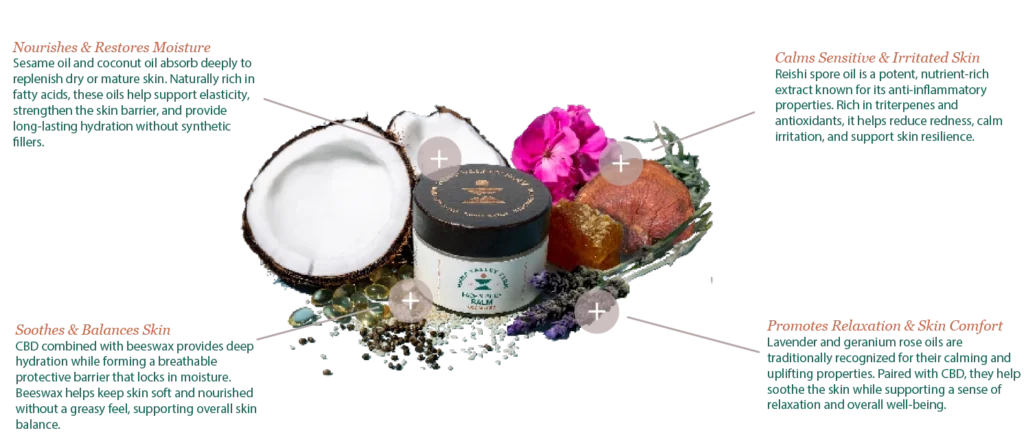 Infused with full-spectrum CBD, reishi spore oil, beeswax, lavender, and geranium rose, the balm delivers targeted support for dry, sensitive, or irritated skin while promoting a smooth, healthy-looking appearance. Its slow-crafted formula absorbs without clogging pores or leaving residue, making it ideal for daily use on the face, body, hands, or areas in need of extra care.
